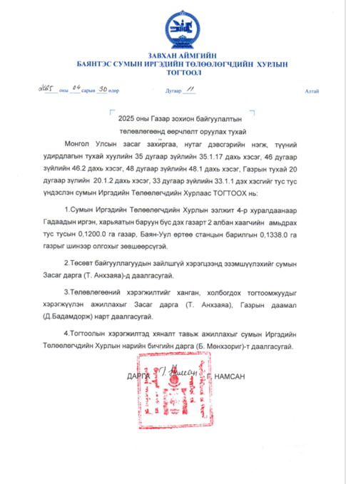 2025 оны газар зохион байгуулалтын төлөвлөгөөнд өөрчлөлт оруулах тухай